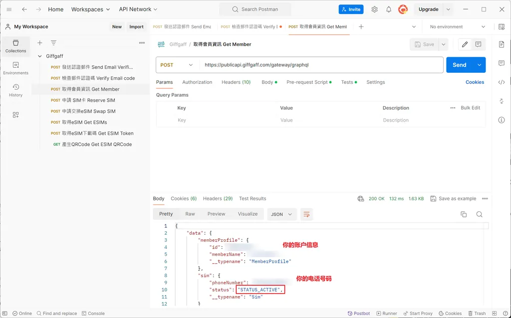 首先,点击侧边栏的 Giffgaff 文件夹,进入 Authorization 标签页拉到下方,点击 Get New Access Token 按钮登录账号
